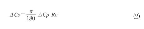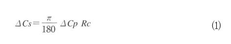 회전축(C축)의 프로그램 상의 상대이동량 △Cp(°)에 의한 전개면 상의 이동량 △Cs(mm)의 관계는 식 (1)로 표현된다. Rc는 원통 반경이다.