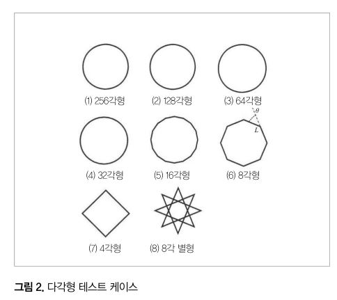 그림 2에 나타냈듯이 테스트 케이스의 지령 궤적은 반경 25mm의 원에 내접하는 (1)~(8)의 다각형으로 하고, 전개면에서 지령 프로그램을 작성해 운동시킨다.
