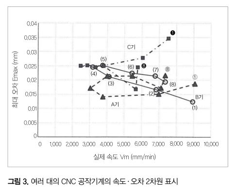 이와 같은 결과가 각 테스트 케이스마다 8시트 얻어졌다. 이들로부터 그림 3과 같이 실제 속도와 최대 오차에 주목해 2차원 그래프로 표현함으로써 여러 대의 CNC 공작기계 회전축․직진축의 고속․고정도성을 1개의 그래프로 평가, 비교할 수 있다.