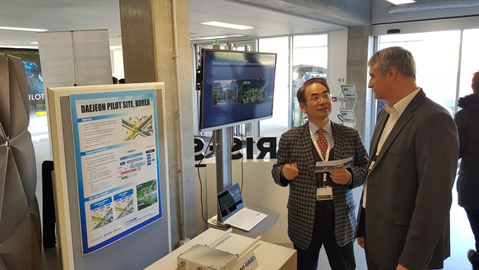 ▲프랑스 베르사유 오토파일럿(AUTOPILOT) 전시장에서 참석자에게 ETRI 개발 기술을 설명하고 있는 오현서 책임연구원