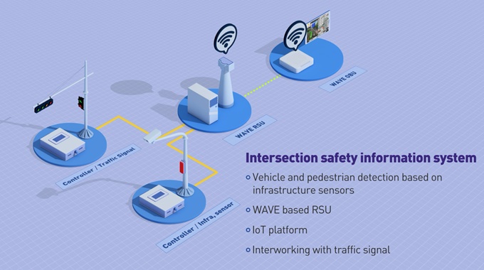 교차로 안전정보 시스템은 보행자나 차량을 감지하고 관련 정보를 자율주행차량에게 전달하여 미리 상황에 대응할 수 있도록 돕는다. 연구진이 개발한 기술은 동적지도(LDM) 정보를 만드는 교차로 안전 시스템과 정보를 생성해 차량에 경고를 표현하는 서비스 단말로 구성되어 있다.