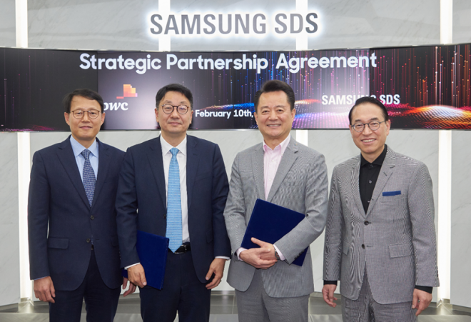 ▲(우측부터)삼성SDS 홍원표 대표이사, 임수현 전략기획담당(부사장), PwC 이기학 대표이사, 임기호 본부장(전무)