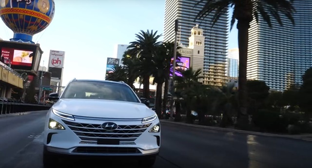 ▲ 현대자동차의 수소전기차 넥쏘(NEXO)가 미국 라스베가스를 주행하고 있다. (사진 : 현대자동차 유튜브 캡처)