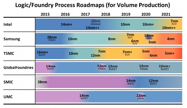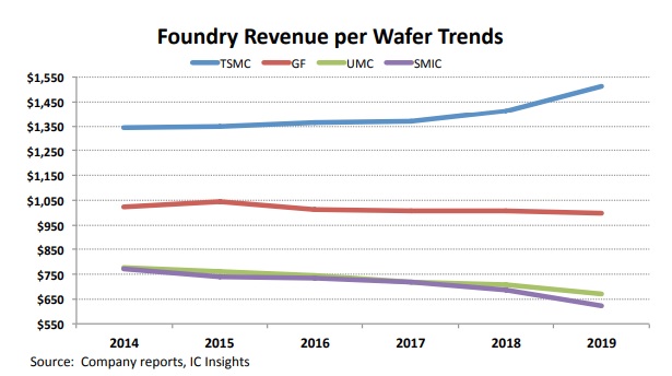 반면, 10나노 미만 공정에 아직 진입하지 않은 파운드리 업체인 미국의 글로벌파운드리(GF), 대만의 UMC, 중국의 SMIC의 2019년 웨이퍼 당 매출액은 2014년에 비해 각각 2%, 14%, 19%가 감소했다. 이들 기업의 가장 작은 프로세스 노드는 12나노와 14나노다.
