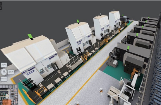 이에 따라 3D 통합 관제시스템(FACTORY CUBE)은 공장동 내의 종합 지표 현황(일생산, 설비가동, 설비, 품질 현황), 설비종합 효율 현황, 생산품의 진행 현황, 공장동 내 환경(온도/습도/전력/절삭유) 정보 그리고 이상 감지를 통해 알람 발생 정보 등을 표현하고 있다. 또한, 3D 객체(건물, 구조물, 설비, 장비 등)의 최적화된 모델링을 만들어 운영자가 직접 관리할 수 있는 기능을 제공한다. 운영자는 객체 모델링 관리 및 객체 위치 관리 기능을 통해 실제 운영 환경에 적용시키기 전, 건물/설비/시설물 등의 배치 시뮬레이션을 실행할 수 있다.