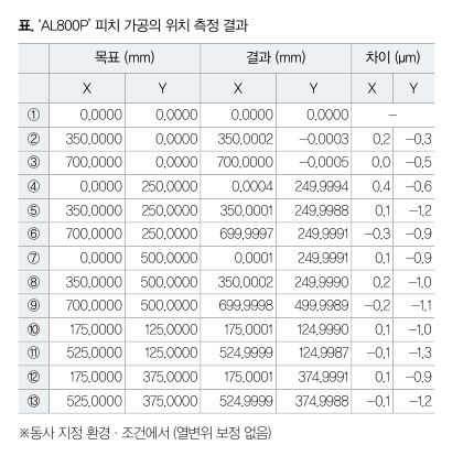 대형기에 대한 고정도 요구로서 피치 가공이 있는데, AL800P에서는 13구멍의 피치 가공(그림 3)에서 피치 정도 -1.3~0.4μm를 달성했다(표).