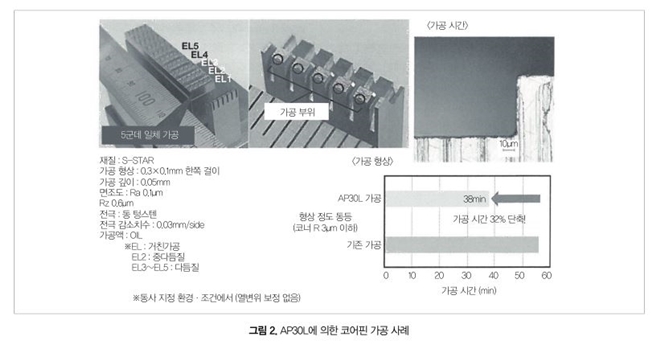 고정도․고속화 기술의 실제 예로서 코어핀 가공에서는 코너 R 3μm 이하의 정도를 내면서, 기존보다 가공 속도를 32% 단축했다(그림 2). 80mm 폭의 피치 가공에서는 피치 정도, 가공 깊이의 편차(Z축 방향) 모두 ±1μm의 고정도 가공을 가능하게 했다. 이것에 의해 다수 개 떼기 금형의 가공 등에서 고정도화에 의한 품질 향상을 기대할 수 있다.