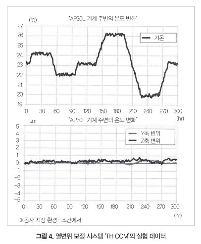 이 TH COM은 기계 주변의 온도 변화에 대해 특히 영향이 컸던 Y축 및 Z축의 열변위량을 ±1μm(20~26℃의 환경, AP30L에서)로 억제했다(그림 4).