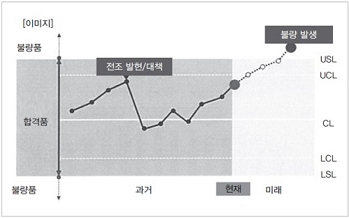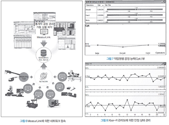 대표적인 예로서는 공정의 안정 상태 유지를 목적으로 실행 도표나 관리도(Xbar-R 관리도)를 이용해 실시간으로 품질 상태를 관리함으로써 이상의 조기 발견과 불량 발생 방지로 이어지고 있다(그림 1).