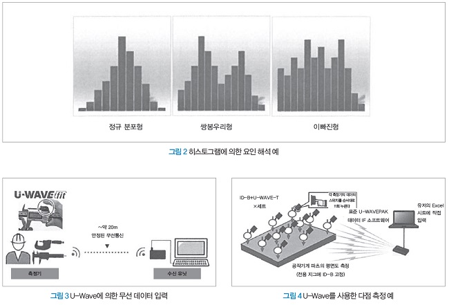 가공 현장에서 사용되고 있는 버니어캘리퍼스나 마이크로미터 등의 측정공구류는 현재는 아날로그 타입보다 디지털 타입 쪽이 널리 보급되고 있다. 측정공구의 디지털화와 함께 PC에 유선 혹은 무선으로 직접 접속하는 것이 가능해졌다(그림 3). 이것에 의해 하나의 측정 스테이션 내에서 계측 네트워크의 구축이 용이해지고, 여러 개의 측정기기류가 동일한 표계산 소프트웨어에 데이터를 전송함으로써 검사성적표의 작성 공수 절감에 크게 공헌한다.