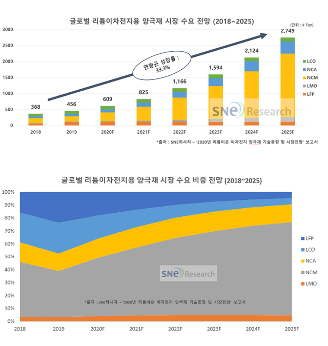 SNE리서치 관계자에 따르면, 향후 전기차 외에도 ESS시장 성장과 소형 전지의 새로운 수요처 발생으로 리튬이차전지 수요가 증가함에 따라 양극재 물질의 개발은 고용량화, 고안전화, 저가격화 위주로 활발히 진행될 전망이다.