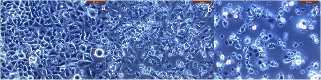 ▲ (A)배양된 폐암세포, Cu-67 투여 전 광학영상, (B)사멸된 폐암세포 (20%), Cu-67 투여 후 8시간 경과, (C)사멸된 폐암세포 (80%) Cu-67 투여 후 24시간 경과 (사진 : 한국원자력연구원)