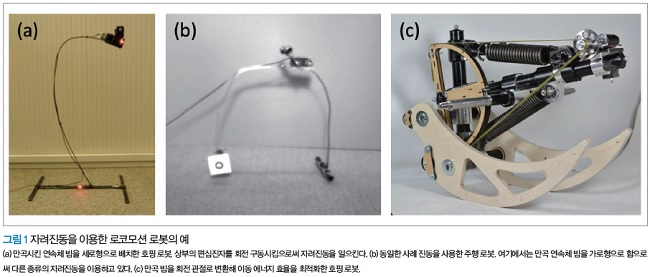 자려진동 현상은 액추에이터의 출력 와트수와 로봇의 질량에 관계없이 그 진동 주파수가 공진 모드와 일치하고 있으면 실현할 수 있다. 그렇기 때문에 보통의 이동 효율 산출 방법(에너지 입력/(질량×이동 거리))에 대해서는 효과적인 방법이다. 필자 등의 연구에서는 로봇의 질량과 에너지 입력을 최적화함으로써 이동 효율이 0.1이라는 결과를 얻을 수 있었다. 이것은 인간의 보행 이동 효율의 약 2배가 되는 것이다.