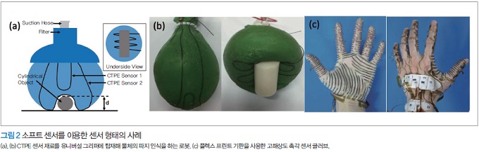 이와 같이 소프트 로봇의 내부에 생기는 힘은 많은 유용한 정보를 포함하고 있는데, 이를 위한 센서 기술은 아직 발전도상에 있다. 일반적으로 이와 같은 센서는 기계적 임피던스(리셉터, 회로, 케이블 등을 포함한 유연성)이 로봇의 유연성과 일치하고 있을 필요가 있는 한편으로, 대자유도의 변형을 가급적 고해상도로 지각할 필요가 있기 때문에 개발과 실장이 어렵다. 필자 등은 이들을 실현하기 위한 센서 기술의 개발에 관계해 왔다(그림 2).