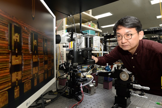 ▲ETRI 한영탁 책임연구원이 400G 광학송수신엔진에 사용된 반도체 광원 칩 살펴보고 있는 모습