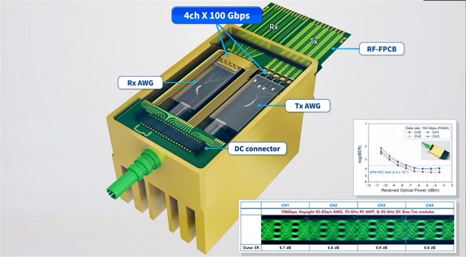 연구진이 개발한 광 송·수신 엔진은 기존처럼 광트랜시버에 내장해 사용도 가능하고 통신 장비 라인카드 보드 상단에 부착도 가능하다. 이렇게 채널당 100Gbps 기반의 광 송·수신 엔진을 이용해 표준 규격을 맞춰 400G급 속도를 달성한 것은 연구진이 세계 최초다.