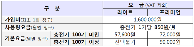 충전서비스는 기능에 따라 ‘라이트’와 ‘프리미엄’으로 구분해서 제공되며, 서비스 요금은 충전사업자가 시스템을 직접 개발해서 운영하는 비용 대비 10% 수준(충전기 1천기, 10년 운영 기준)으로 책정해 중소규모 사업자의 비용부담을 최소화했다.