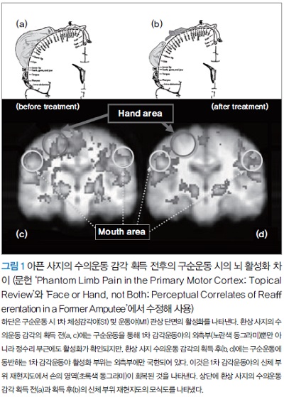 예를 들면 상지 절단 후, 환상 사지통 환자는 손의 신체 부위 재현지도가 없어지고, 대신에 손의 신체 부위 재현지도 옆에 있는 안면의 신체 부위 재현지도가 확대된다(그림 1). 이와 같은 변화는 하지 절단 후 환상 사지통이나 척수 손상 후 동통 환자에서도 관찰되며, 하지의 신체 부위 재현지도가 상실되어 몸통․안면의 영역이 확대되고 있다. 그리고 이 신체 부위 재현지도의 축소가 신경장애성 동통 환자가 호소하는 동통 강도와 관련 있다는 것도 밝혀져 있으며, S1이 동통의 식별에 관련되어 있다고 하는 생리학적 지견과 일치한다. 더구나 운동계에서도 기능 재구축이 밝혀져 있다.