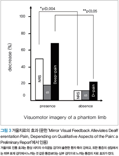 필자 등은 지금까지 환상 사지통에 대한 신경 리허빌리로서 거울을 이용한 치료법(거울치료)를 실시해 왔다(그림 2). 이 때 환상 사지 수의운동을 획득한 환자의 동통 감소율은 유의미하게 컸으며, 또한 통증의 성질마다 유효성을 평가하면 심부 감각에 관련된 동통은 거울치료에 의해 개선됐다(피부 표재 감각에 관련된 동통은 개선되지 않았다)(그림 3).
