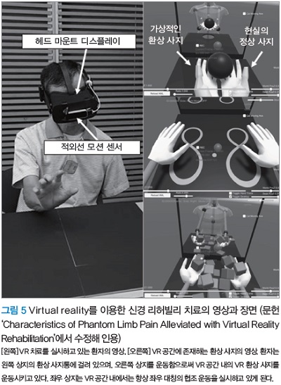 거울치료보다 강력한 치료법을 개발할 목적으로 체성 감각과 시각을 이용하고, 또한 사지에 관한 올바른 시각 정보(영상)을 입력해 지각-운동 루프의 협응 관계를 재통합할 수 있으며, 나아가 실험적 조작이 간편한 VR(그림 5)을 이용한 환상 사지통의 신경 리허빌리테이션 치료에 대응하고 있다.