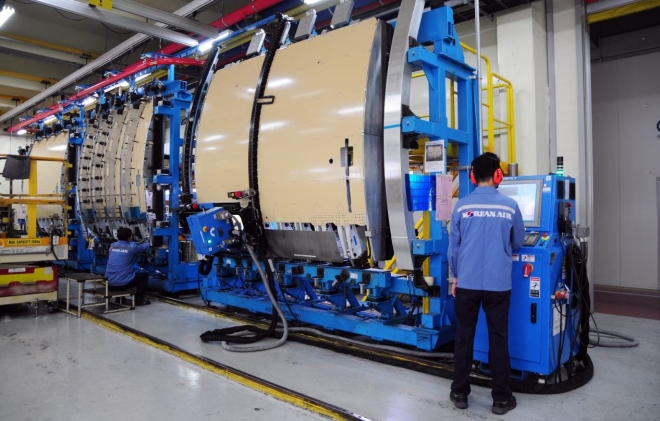 ▲A350 항공기 카고 도어 조립장에서 대한항공 직원들이 작업하고 있는 모습