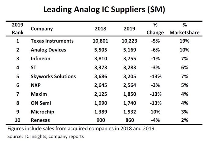시장조사기관 IC인사이츠의 보고서에 따르면 2019년 아날로그 IC 시장은 562억 달러의 매출을 기록했으며, 이 중 상위 10개 공급업체가 차지하는 비율은 62%(342억 달러)에 달했다. 이는 2018년 상위 10개 기업의 점유율 60%에서 2% 증가한 수치다. 아날로그 반도체 시장의 상위 10개 공급 기업 순위는 다음과 같다.