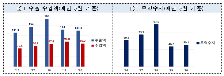2020년 5월 정보통신기술(이하 ‘ICT’) 수출 139.3억 달러, 수입 89.2억 달러, ICT 무역수지는 50.1억 달러 흑자로 잠정 집계된 가운데 수출액의 일등 공신은 ‘반도체’였다.