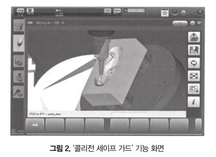 최신 제어장치 프로페셔널 6에서는 ‘콜리전 세이프 가드’라고 하는 실시간 간섭 체크 기능이 내장되어 있다. 이것은 기계의 동작보다 빠르게 시뮬레이션함으로써 간섭 발생을 예견하고, 기계를 안전하게 정지하는 안전 기능이다.