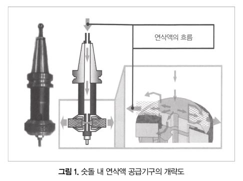 연삭액 공급 방법은 숫돌 내 연삭액 공급 및 보통의 외부 노즐 연삭액 공급을 이용했다. 그림 1에 숫돌 내 연삭액 공급기구의 간략도를 나타냈다. 숫돌은 툴홀더의 플랜지에 의해 고정되고, 머시닝센터(MC)의 주축에 장착한다. 연삭액은 MC의 스핀들 스루 기구를 이용해 숫돌의 기공을 통해 가공점에 공급된다.