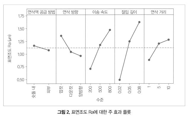 그림 2에 표면조도 Ra에 대한 주 효과 플롯을 나타냈다. 전체 조건의 평균은 Ra 1.12μm가 됐다. 각 인자의 기여율을 구하면, 절입 깊이는 40.9%, 이송 속도는 27.4%, 연삭 거리는 14.4%, 연삭 방향은 14.1%, 연삭액 공급 방법은 3.1%의 순으로 표면조도에 영향을 미치는 것을 알 수 있었다.
