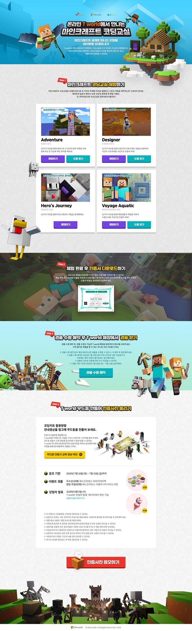 ‘마인크래프트’ 온라인 코딩교실 참여 희망자는 7월 1일부터 SK텔레콤 온라인 티월드에서 신청 가능하다. 혜택/이벤트 게시판에서 진행중인 이벤트를 선택, ‘체험하기’ 버튼을 누르면 수업에 참여할 수 있다.