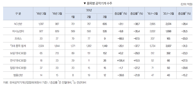 2020년 1 ~ 3월 공작기계 수주는 4965억원으로 전년동기대비 32.4% 감소했다. 내수수주는 2465억원으로 전년동기대비 24.2% 감소했으며, 수출수주 또한 2500억원으로 전년동기대비 38.9% 감소했다.