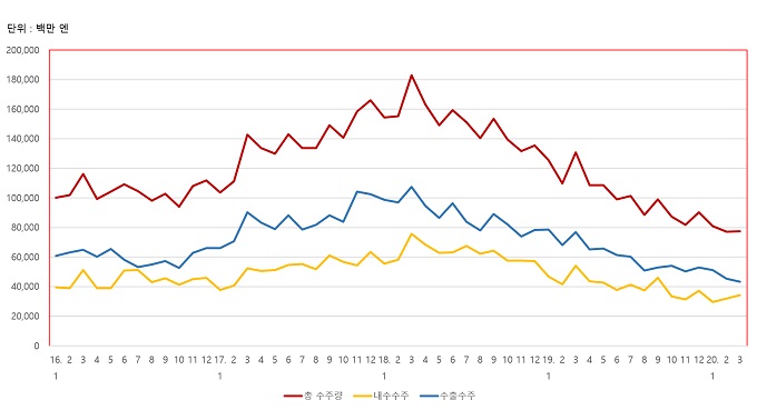 지역별로는 아시아 지역이 전월대비 18.0% 증가한 191.0억 엔을 기록했다. 전년동월과 비교해서는 39.1% 감소한 금액이다. 유럽은 전월대비 34.0% 감소한 72.1억 엔을 기록했다. 전년동월과 비교해서는 61.4% 감소했다. 북미는 전월대비 6.7% 감소한 161.8억 엔을 기록했다. 전년동월과 비교해서도 34.3% 감소한 수치다.