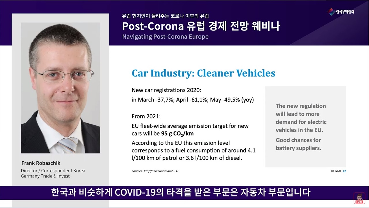 독일무역투자진흥처의 프랑크 로바식 한국대표는 “독일도 항공, 호텔, 자동차, 건설 등 분야에서 큰 타격을 받았지만 국내총생산(GDP)의 4%에 달하는 대규모의 경기부양책을 시행하고 있어 유럽연합(EU) 평균보다는 경기 침체 수준이 낮을 전망”이라며 “내년부터 시행되는 EU의 배기가스 배출규제는 전기차와 배터리 공급 업체에게 좋은 기회”라고 강조했다.
