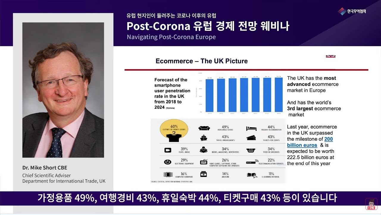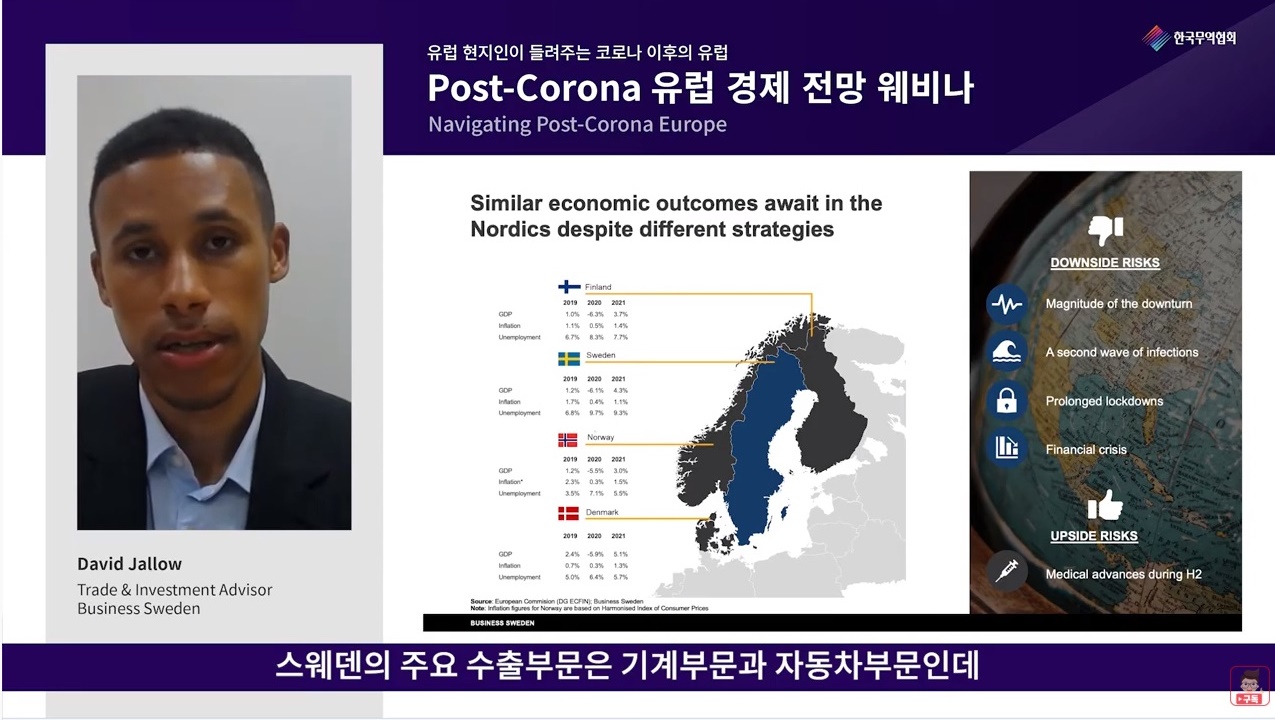 한국무역협회(이하 무협)는 이달 24일, 영국 국제통상부, 독일 무역투자진흥청, 비즈니스스웨덴과 함께 ‘포스트 코로나19 유럽 경제전망’웨비나를 개최했다.