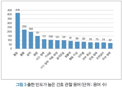 또한 간호 실천 용어 표준 마스터 간호 관찰 편 Version 3.4에는 6,063개의 용어가 기재되어 있다. 거기에서 ‘초점’은 통증(419단어), 출혈(224단어), 발적(198단어), 종창(151단어), 사고 장애(112단어), 가려움(106단어) 등을 들 수 있다(그림 3). 이 중에서 출혈이나 발적 등은 의료 종사자의 시각에 기초해 관찰을 하는 생체 현상이기 때문에 이미지 인식을 통해 기계적으로 관찰을 할 수 있는 가능성도 충분히 있을 것이다.