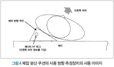 이와 같이 IoT를 활용해 일상생활 원조적인 개입 행위를 검출하는 개념의 공유를 목적으로, 필자는 ‘체압 분산 쿠션, 체압 분산 쿠션의 사용 방향 측정장치’를 고안했다. 이것은 패시브 RF 태그를 설치한 체압 분산 쿠션을 사용함으로써 그 쿠션의 사용 방향을 간편하고 정확하게 측정 가능하게 하는 것이다(그림 4).