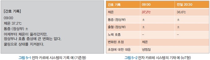 앞에서 말한 발열 예를 이용해 IoT의 활용에 의한 기록 양식의 변화를 나타냈다(기존형 : 그림 5-1, IoT형 : 그림 5-2). 기존형의 간호 기록은 체온이나 통증 수준과 같은 정형적인 항목(체온과 같은 연속 척도 외에, 통증 수준과 같이 순서 척도로 표현할 수 있는 사항 등)에 한해 표 형식의 기록으로 기재하고, 그 이외는 문장으로 서술하는 형식이 일반적이었다. 이 방법은 표와 문장이 물리적으로 분리되어 기재나 참조의 수고가 늘어날 뿐만 아니라, 쌍방의 정보를 연관시켜 임상 판단을 하기 어려운 면도 문제였다. 물론 서술된 기록은 간격 척도도 순서 척도도 아니므로 정성적 데이터로서 취급할 수밖에 없다. 따라서 이러한 데이터를 다음에 활용하는 경우는 인간의 사고에 의존하지 않을 수 없고, 의사 결정 지원 시스템의 도입은 아직 먼 상황이었다.