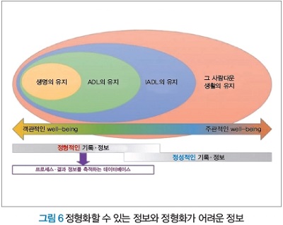 간호사와 간병인은 인공지능과는 비교적 거리가 있는 직업이라고 흔히 말한다. 생명 유지라는 객관적인 well-being을 추구하기 위한 원조는 객관적인 데이터에 기초해 제공되는 경향이 있다. 이것에 대해 그 사람다운 생활을 유지하는 주관적인 well-being을 추구하기 위한 원조는 주관적인 데이터가 토대가 된다(그림 6). 특히 재택 케어에서는 그 경향이 강한 것을 필자는 위원장을 맡고 있는 조사연구사업 등에서 말해 왔다. 따라서 이 글에서 전망하고 있는 IoT 활용의 관점도 생명의 유지, ADL의 유지 및 IADL의 유지가 수비 범위이다.