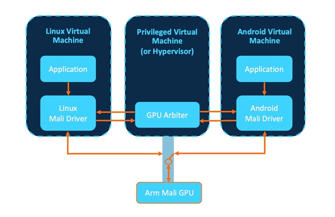Arm은 기존 Mali DDK에 새로운 가상화 지원 기능을 제공함으로써, 다양한 가상머신(virtual machine)을 구동하는 그래픽이 풍부한 여러 애플리케이션들 간에 GPU 리소스가 공유될 수 있도록 한다. 더불어, Arm은 개발자 도구 뿐만 아니라 IP 단계에서부터 내장된 보안의 중요성을 강조한다. 이는 특정 가상머신의 정보에 다른 가상머신이 접근할 수 없도록 되어있는 Mali DDK 가상화 기능에서 분명하게 나타난다. Mali DDK 가상화는 애플리케이션에서도 전혀 보이지 않도록 설계되었으며, 모두 드라이버 내부와 시스템 소프트웨어에서 실행되고 있으므로 개발자는 이를 지원하기 위해 별도로 애플리케이션을 수정할 필요가 없다.