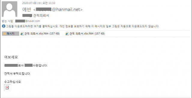 본문에는 ‘견적서를 부탁한다’는 내용을 적고 엑셀 문서로 위장한 ‘견적 의뢰서.xlsx.htm’이라는 제목의 인터넷 문서 파일(.htm)을 첨부했다. 만약 사용자가 무심코 이 파일을 실행하면 포털 사이트 로그인 화면으로 위장한 피싱 페이지로 연결된다.