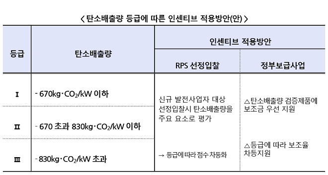 ▲ 산업부가 발표한 탄소배출량 등급에 따른 인센티브 적용방안(안) (자료 : 산업통상자원부)