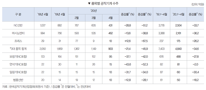 2020년 4월 품목별 수주를 보면, NC절삭기계는 전월대비 20.0% 감소한 1150억원을 기록했다. 범용절삭기계도 전월대비 30.4% 감소한 25억원을, 성형기계도 전월대비 5.4% 감소한 12억원을 기록했다.