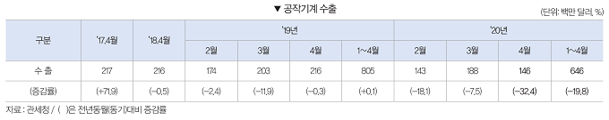 2020년 1~4월 공작기계 수주는 6,152억원으로 전년동기대비 34.8% 감소했다. 내수수주는 3,161억원으로 전년동기대비 24.0% 감소하였으며, 수출수주 또한 2,991억원으로 전년동기대비 43.3% 감소했다.