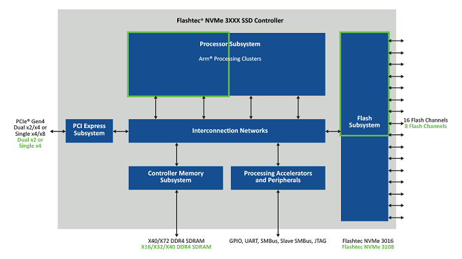 이 컨트롤러는 8채널 Flashtec NVMe 3108 16채널 Flashtec NVMe 3016 제품을 보완하고 광범위한 데이터센터 스토리지 요건을 충족하는 다양한PCle 4세대 NVMe SSD 솔루션을 제공한다.
