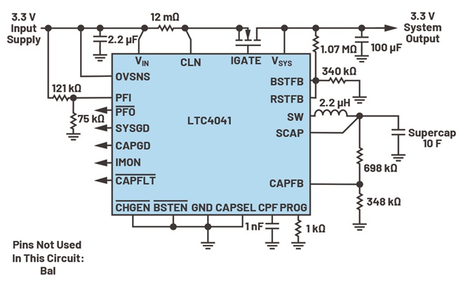 입력 전원이 조정 가능한 PFI(Power Fail Indicator) 임계값 아래로 떨어지면, LTC4041은 부스트 모드 동작으로 전환하여 수퍼커패시터로부터 시스템 부하에 최대 2.5A를 공급할 수 있다. 전원 장애가 발생하면 디바이스의 PowerPath 제어가 역전압 차단 및 입력 전원으로부터 백업 전원으로 매끄러운 스위치오버를 제공한다. LTC4041의 일반적인 애플리케이션으로는 의료용 장비, 전력 미터, 산업용 경보, SSD(solid-state drive)에 흔히 볼 수 있는 작동 유지 dying gasp 전원을 포함한다. 그림 1은 일반적인 LTC4041 애플리케이션 회로도를 보여준다.