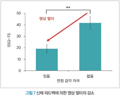 이 구성에 의해 TwinCam의 설치 장소가 변화하지 않는 경우는 머리부를 회전한 방향의 시차붙이 영상이 겉보기 상 지연 없이 제시되지만, TwinCam이 Segyway 주행으로 이동하는 경우는 단안시의 경우보다 운동 멀미의 가능성이 있다. 그렇기 때문에 TwinCam Go 시스템은 카메라의 운동에 대응하는 신체의 가속도를 주는 것으로 지각 정보의 통합 과정을 보정해 영상 멀미를 감소(그림 7)시키고 있다. 이 경우 가속도의 피드백은 가속도계로 측정된 일정 이상의 가속도에 대해 Segway 운동과 동일한 방향으로 제시된다. 그때의 가속도는 카메라의 운동 측정값보다 작고, 더구나 단시간에 충분한 효과가 있으며, 또한 보통의 모션 베이스와 동일하게 임계값 이하의 아주 작은 가속도로 초기 위치로 되돌아가도록 제어되어 있다.