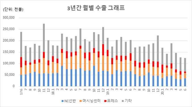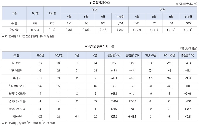 2020년 6월 공작기계 수출은 1억2,400만 달러로 전월대비 2.2% 감소했다. 전년동월과 비교해서는 38.9% 감소했다. 2020년 1∼6월 공작기계 수출은 8억9,600만 달러로 전년동기대비 25.6% 감소했다.