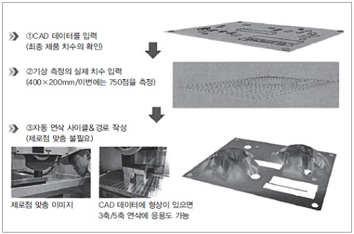 ① 최종 제품 치수 데이터로서 CAD 데이터를 입력함으로써 구멍, 홈 등의 부위를 피한 다점 측정 경로.