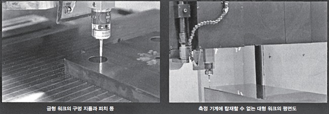 초정밀 평면 연삭반은 테이블 좌우 축이 고정도인 진직 운동의 정압 접동면과 정확한 위치결정을 가능하게 하는 리니어모터 구동에 의해 가공 워크의 X방향(좌우), Y방향(상하), Z방향(전후)의 3차원 기상 측정이 가능하기 때문에 연삭 후 가공 워크의 평면도뿐만 아니라, 기상에서 원통도, 평행도 등의 금형가공에 필요한 측정이 가능한 3차원 기상 측정 소프트웨어 ‘OKAMOTO NC 게이지’(그림 6)를 개발했다. 측정기에 대한 세팅 불필요, 측정 후의 보정 연삭, 측정기에 실을 수 없는 대형 워크도 측정할 수 있고, 측정 결과를 정량적으로 평가할 수 있는 등의 장점이 있다.